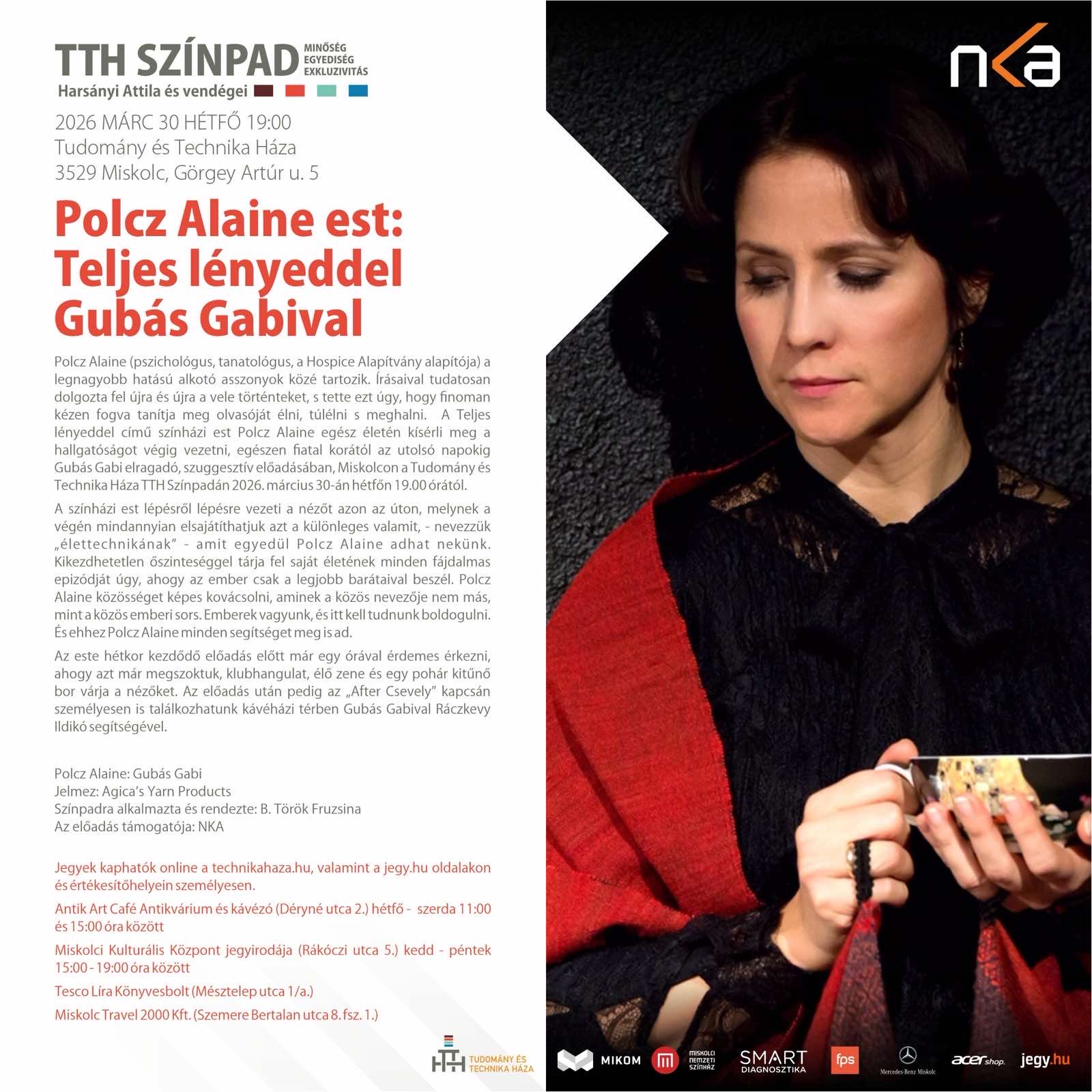 Polcz Alaine (Pszichológus, tanatológus, a Hospice Alapítvány alapítója) a legnagyobb hatású alkotó asszonyok közé tartozik. Írásaival tudatosan dolgozta fel újra és újra a vele történteket, s tette ezt úgy, hogy finoman kézen fogva tanítja meg olvasóját élni, túlélni s meghalni. A színházi est pont erre az attitűdre koncentrál, s lépésről lépésre vezeti a nézőt azon az úton, melynek a végén mindannyian elsajátíthatjuk azt a különleges valamit, – nevezzük „élettechnikának”- amit egyedül Polcz Alaine adhat nekünk. Kikezdhetetlen őszinteséggel tárja fel saját életének minden fájdalmas epizódját úgy, ahogy az ember csak a legjobb barátaival beszél. Polcz Alaine közösséget képes kovácsolni, aminek a közös nevezője nem más, mint a közös emberi sors. Emberek vagyunk, és itt kell tudnunk boldogulni. És ehhez Polcz Alaine minden segítséget meg is ad. A Teljes lényeddel című színházi est Polcz Alaine egész életén kísérli meg a hallgatóságot végig vezetni. Egészen fiatal korától az utolsó napokig.